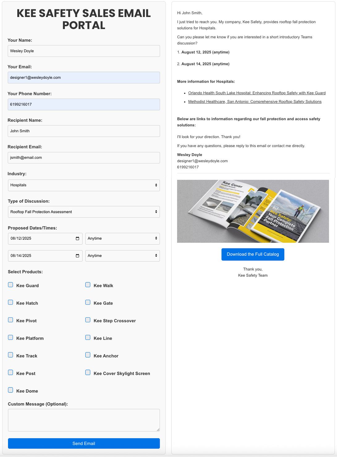 The portal replaced that manual process with a simple web-based form. Reps enter a few details — customer name, email, industry, products of interest, and two proposed meeting times — and the system instantly generates a fully formatted, branded email. Each message is enriched with industry-specific case studies, product links, and a catalog call-to-action, giving prospects more than just a generic follow-up.